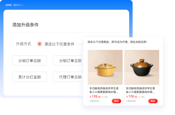 需满足设定的订单数、销售额、下线人数、下线分销商等条件后即可升级,可根据自身需求灵活设置。