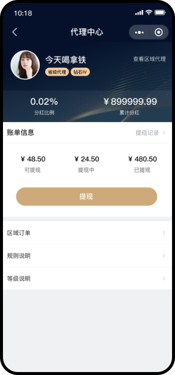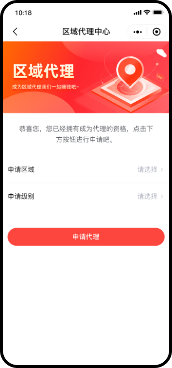 自定义代理商品、申请门槛、分红比例、升级条件、代理中心等相关设置,打造个性化的区域代理体系。